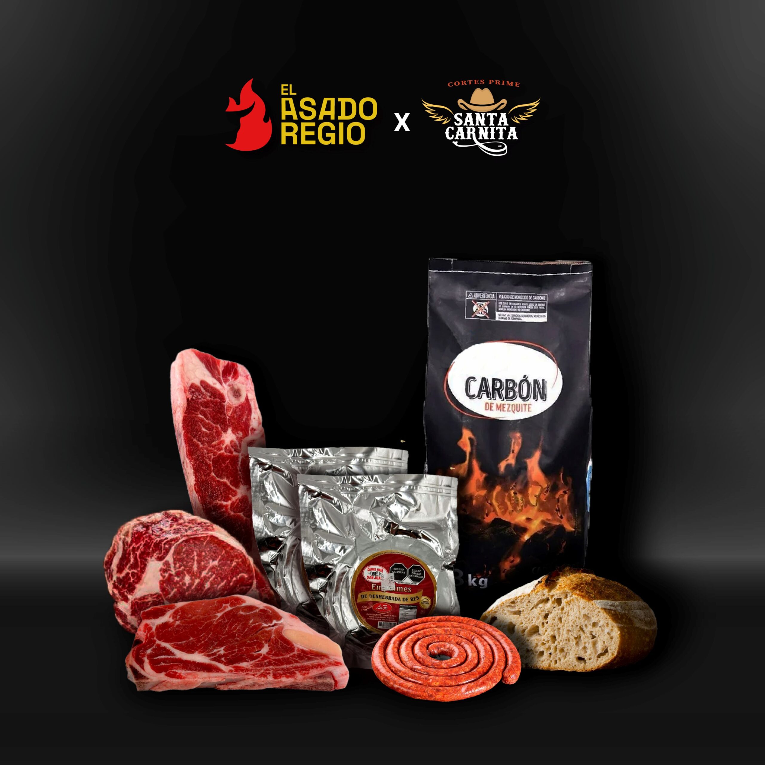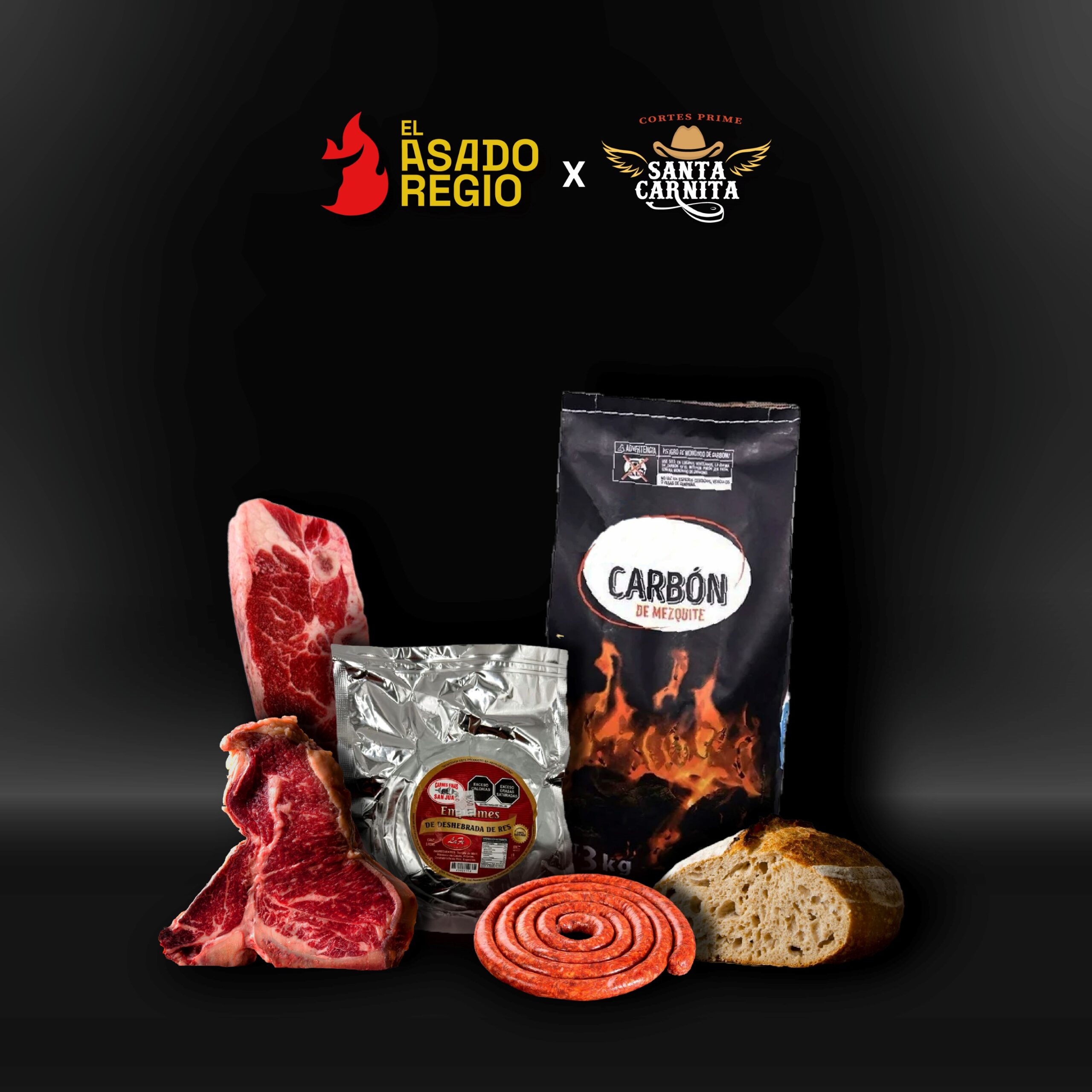 Contiene: Ribeye, NewYork, T Bone, Aguja, Costilla Norteña, 1 Paquete de Chistorra, 1 Paquete de Empalmes, 1 Bolsa de carbón, 1 Pan de masa madre.